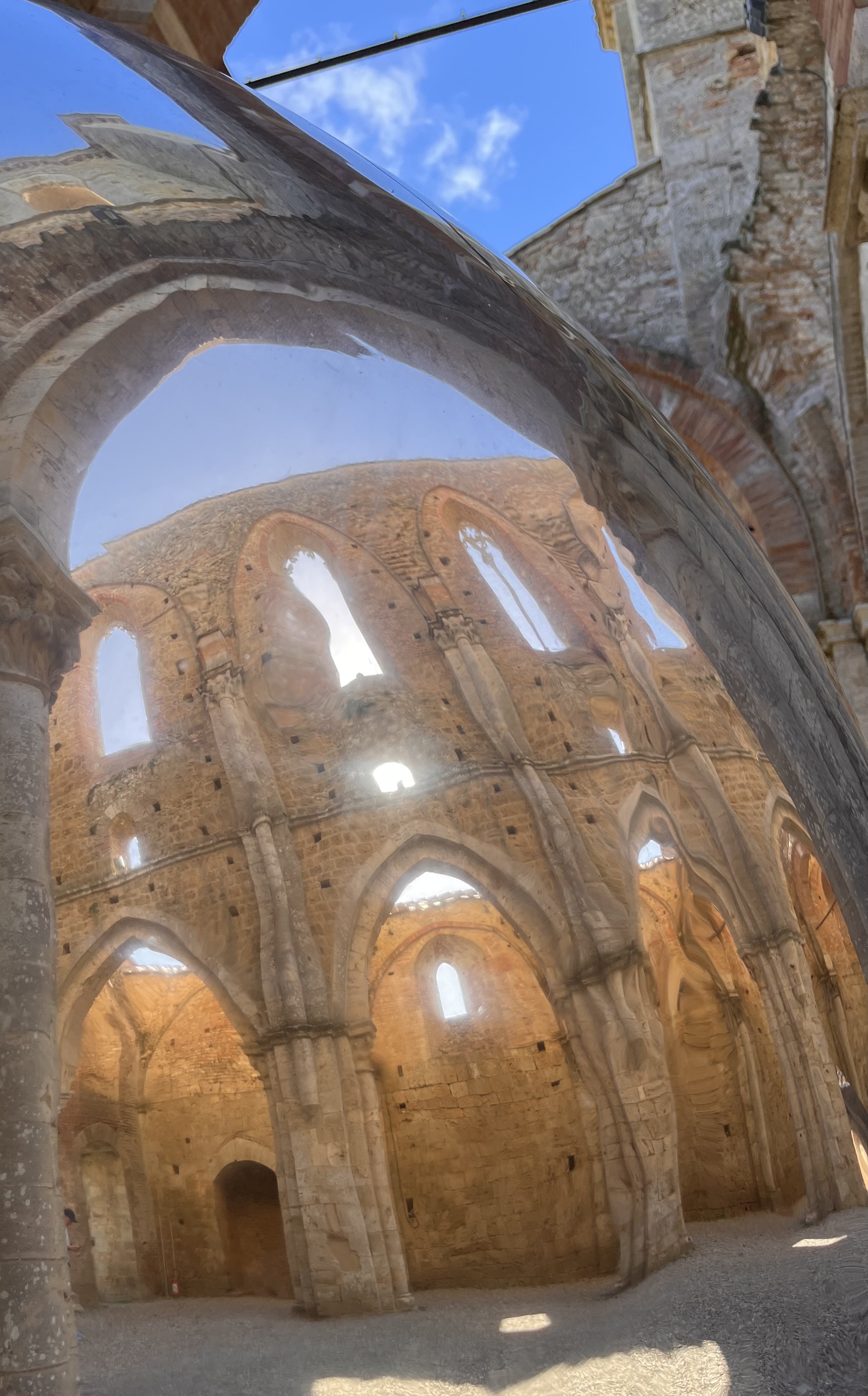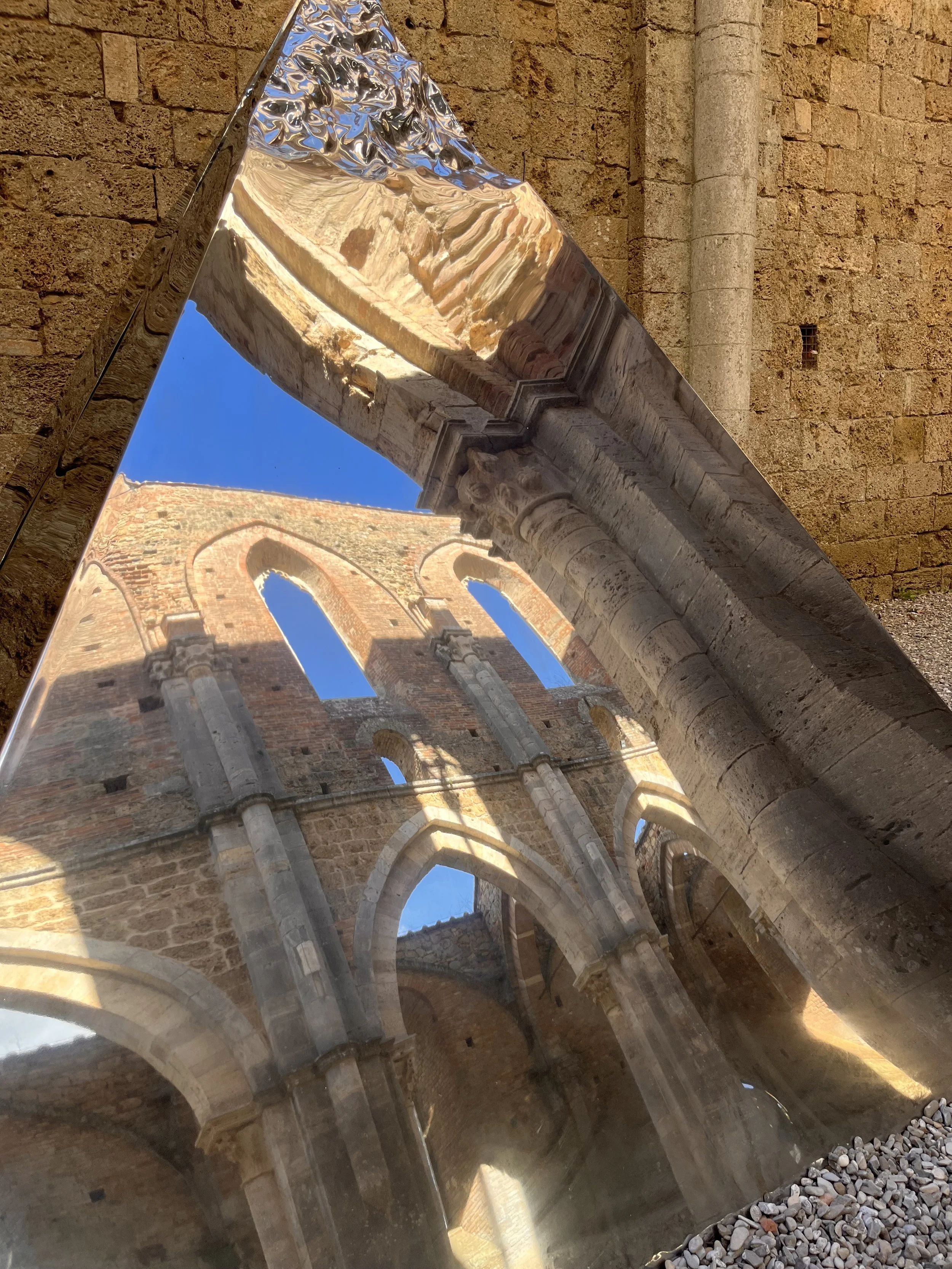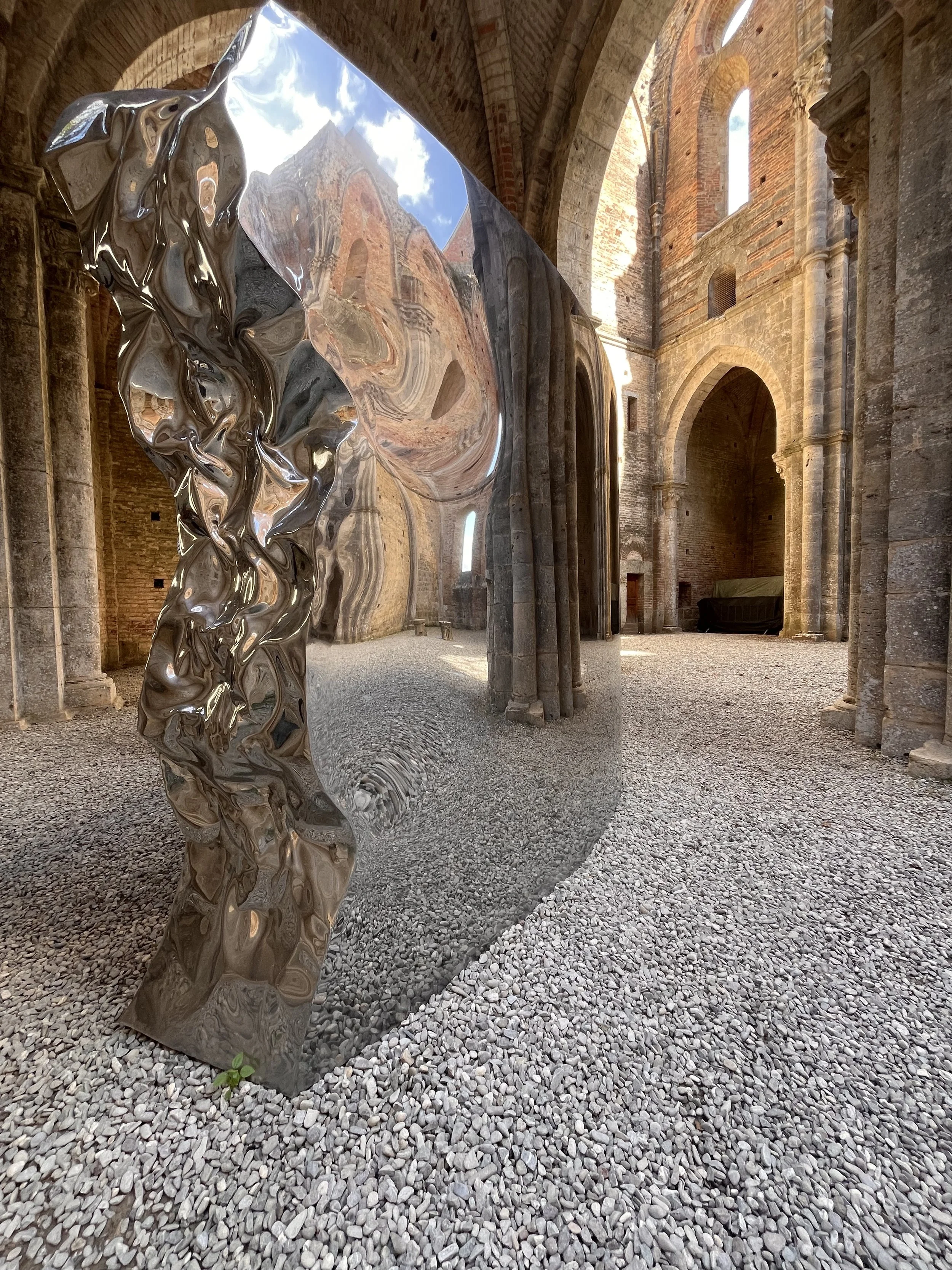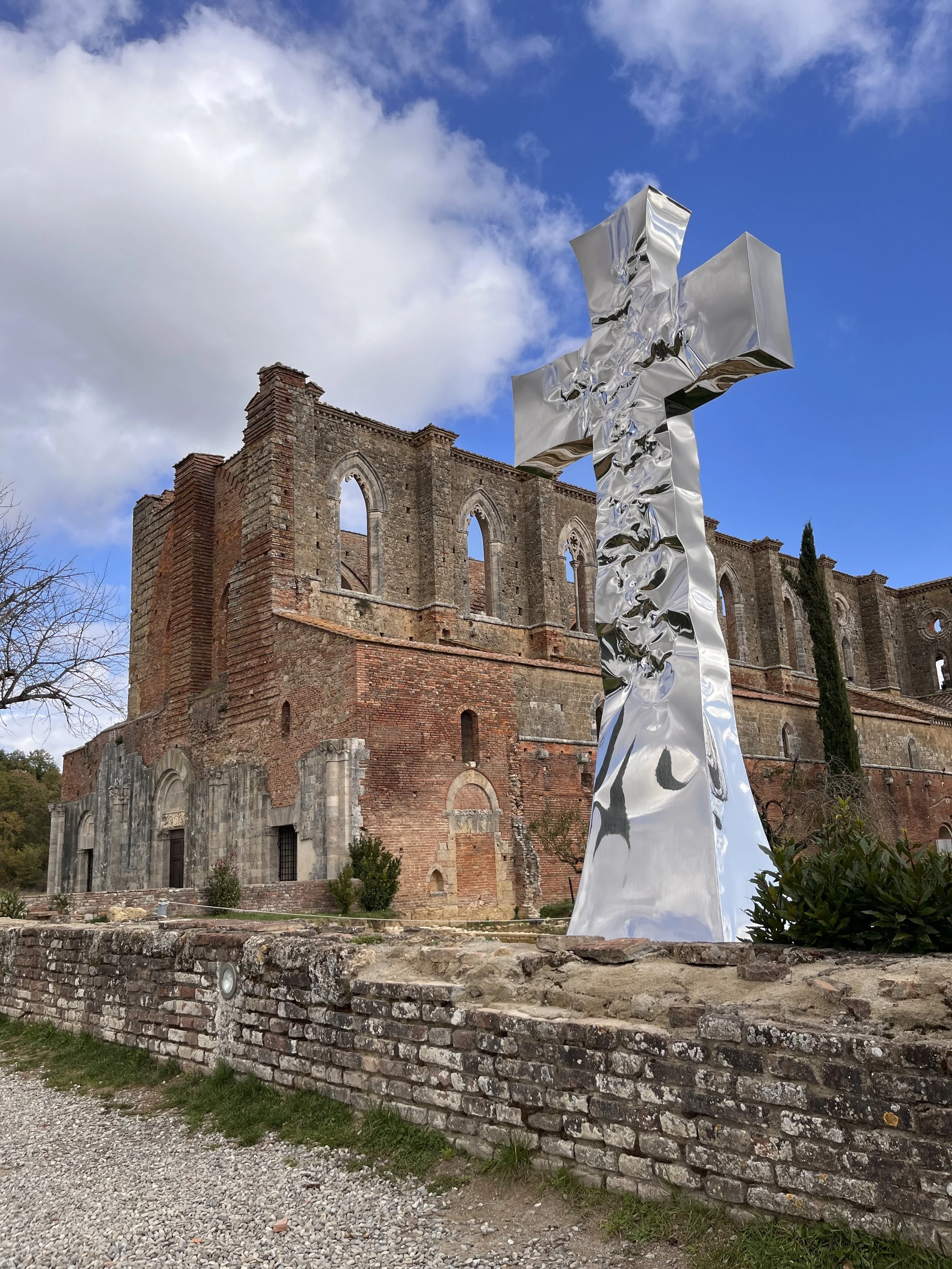 For the occasion of the 2025 Jubilee Year, the Abbey of San Galgano hosted a magnificent exhibition of stainless steel sculptures by Helidon Xhixhi, an Italian-Albanian artist, curated by Carlo Pizzichini. The beauty of the ruins of the Abbey is captured in reflections on the mirror-like surfaces of the sculptures.