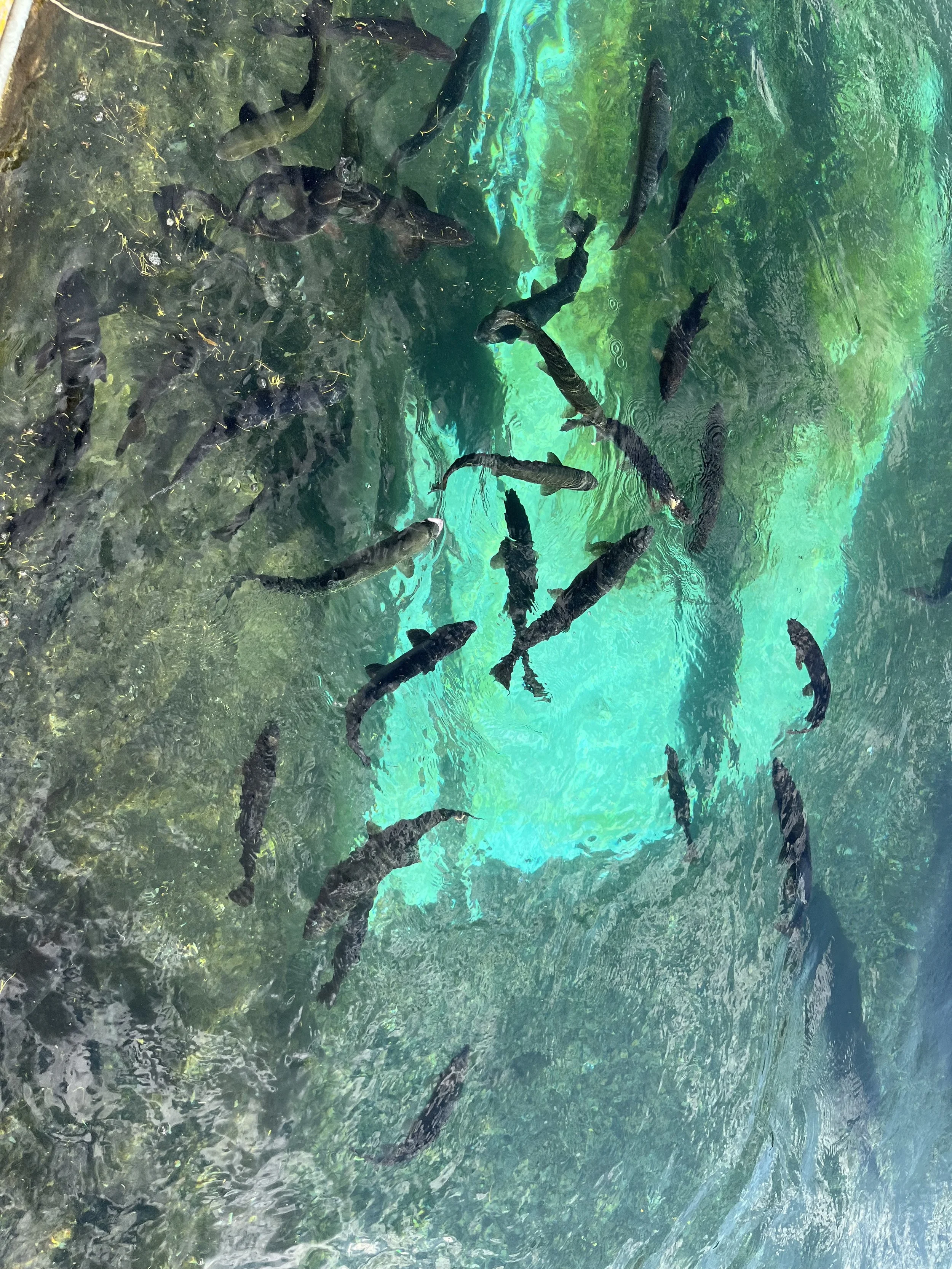 Feeding Frenzy of Trout in the Peschiera; Large Sturgeon on the Bottom