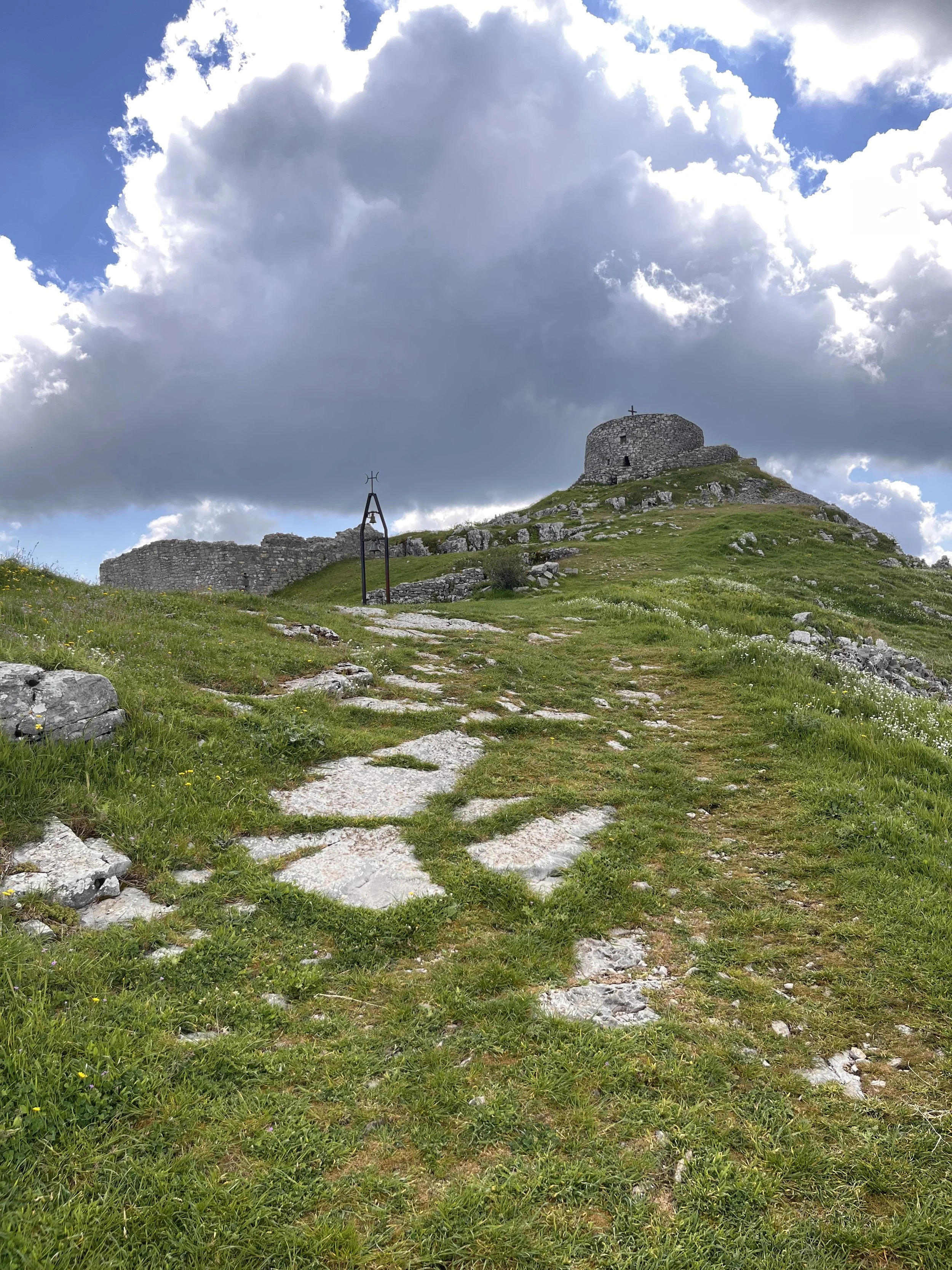 Today, all that remains of Giurisdavidica is a rich composition of ruins. The journey to the ruins (approximately 1.5 km of inclined hiking) begins at the parking area at the base of the peak of Monte Labbro. Ascending the mountain from the parking area to the peak, you witness magnificent views. In the Springtime, the wildflowers are in full bloom. The colors in the landscape along the trail to the peak constantly change, as different species of wildflowers blossom successively as the weeks pass. As the elevation changes along the trail to the peak, the vegetation changes from a prairie environment mixed among craggy rock formations to a steep dense forest. Finally, at the peak, the ruins of Giurisdavidica rise from a grassy knoll. The vast views from the peak are astounding. On a clear day, you can see the Mediterranean Sea.