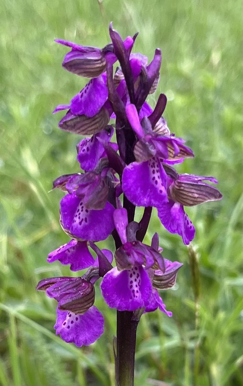 A colony of Anacamptis morio was found at a cool elevation (approximately 2000 feet above sea level) along the gravel road between SP160 and Eremo David Lazzaretti in the Province of Grosseto. This species is also found in abundance along SP441 between San Galgano and Massa Marittima in the Province of Grosseto. This clone has exceptional color.