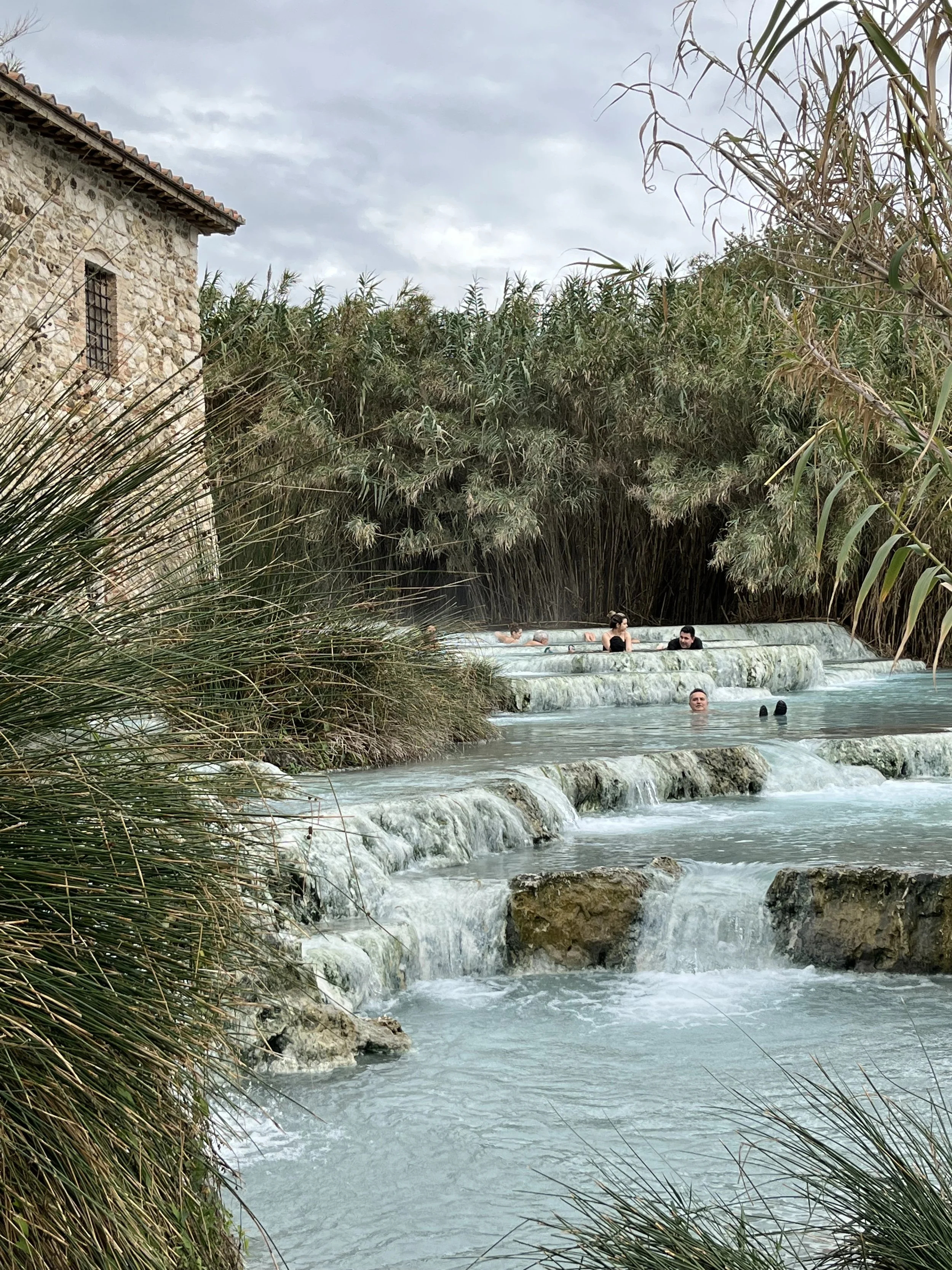 The thermal waters at Petriolo in the province of Grosseto are perhaps the warmest of the outdoor warm springs in Southern Tuscany at a constant temperature of approximately 109° F. The waters are pumped from an underground geothermal reservoir into a series of cascading travertine basins that have formed over time. The ambiance at Petriolo is a bit on the Bohemian side, but don’t be alarmed. Everyone seems to be enjoying themselves.