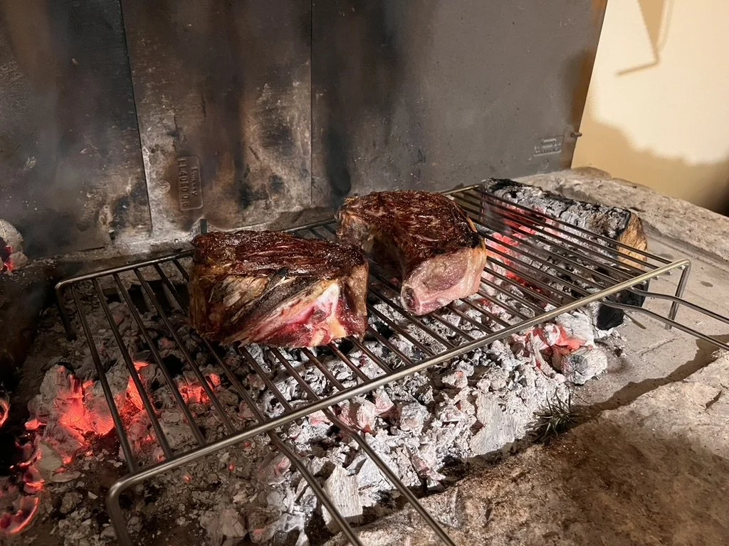 Bistecca alla Fiorentina cooking on the fire in the kitchen at Cas’ Anita